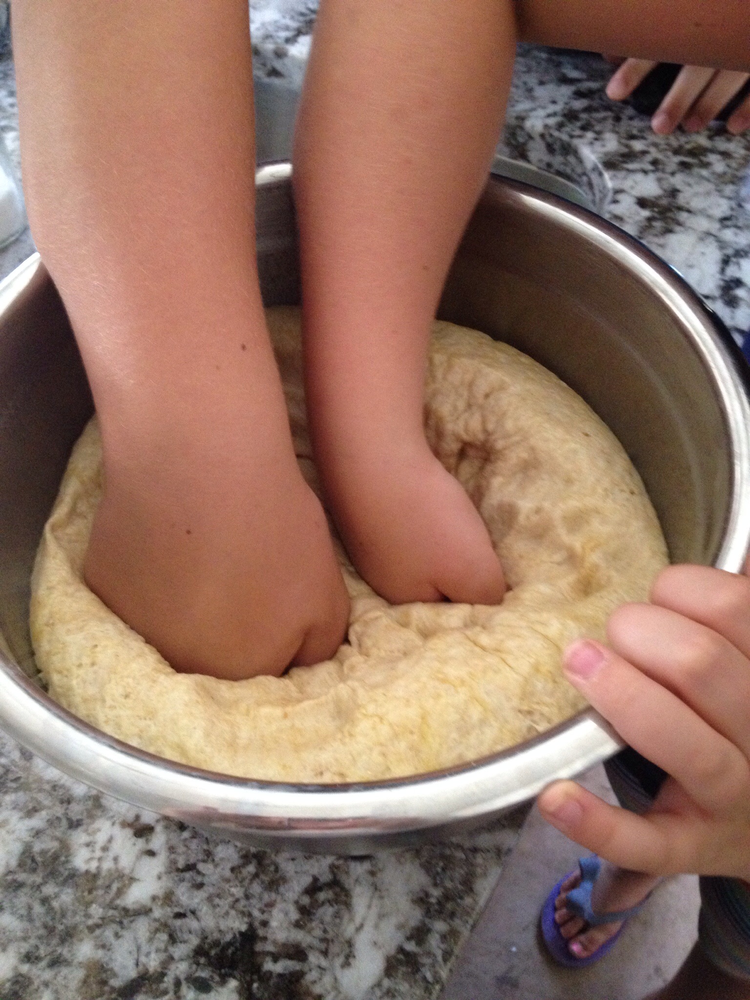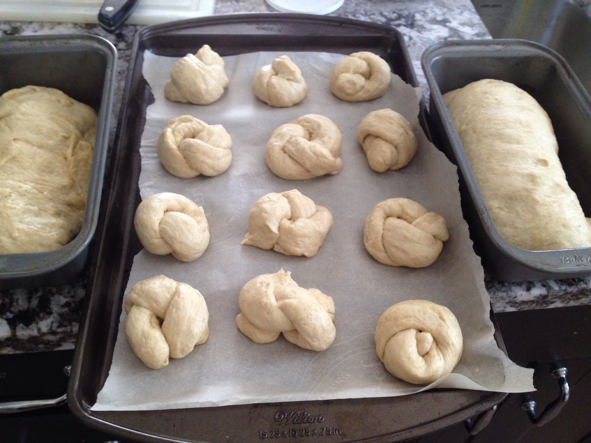 My daughter helped me make 2 loaves of bread and a dozen rolls for sandwiches. Here is the dough before the first rise.