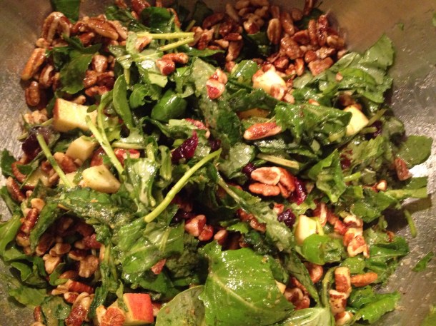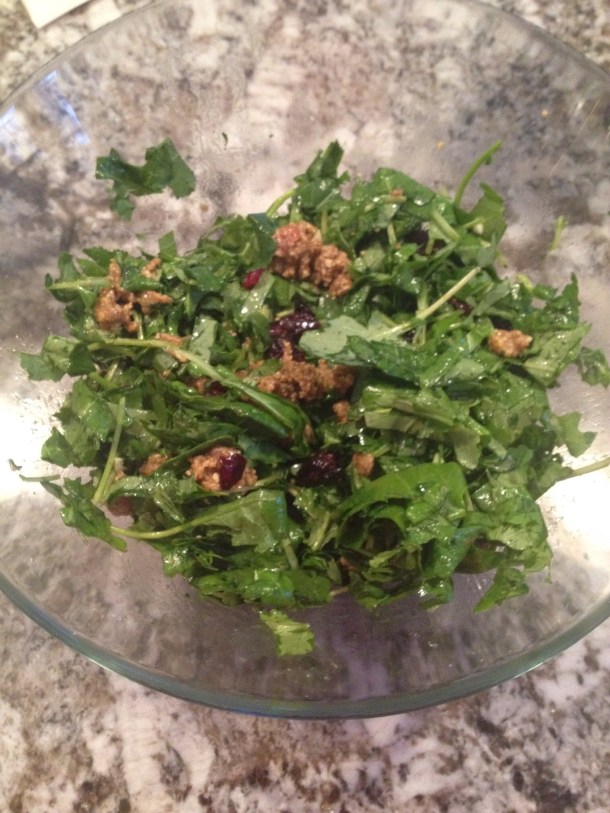 We loved the salad so much there were no leftovers! The next night, I made a similar salad from the cookbook to go with the leftover steak. It’s called Festive Kale Salad with Sweet Apple-Cinnamon Vinaigrette & Pecan Parmesan. Very similar to the first salad I made, but there was apple and cinnamon! So great!