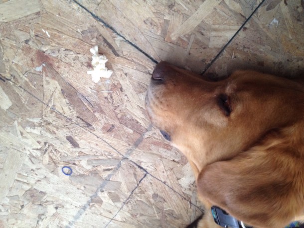 He was sleeping so hard, he didn’t even notice this popcorn fall right in front of him. Anyone who owns a Lab understands how crazy this is! (Isn’t my subfloor soooooo pretty? Renovating is a long process!)