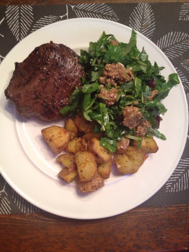 That said, I did spill some meat on my vegan cookbook. Hahahaha! True story! I made one of her fabulous salads from the book but I paired it with carnivore mainstays of steak and potatoes!