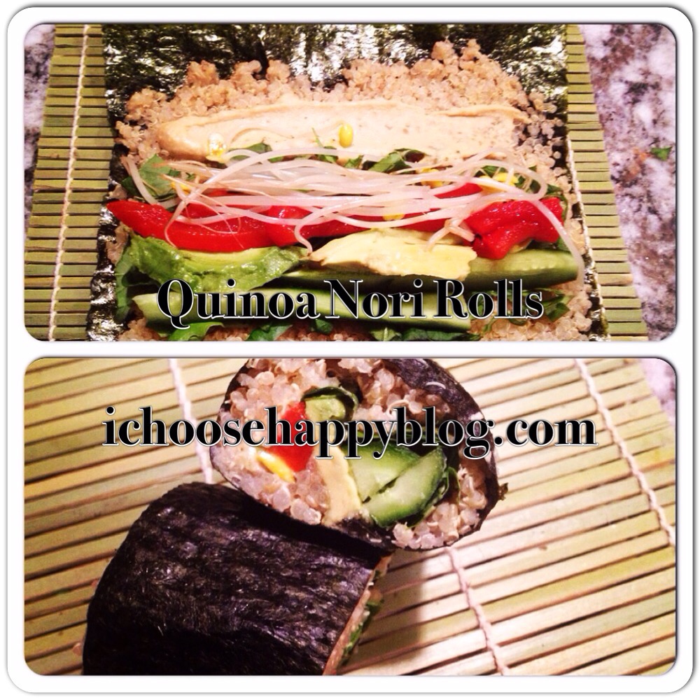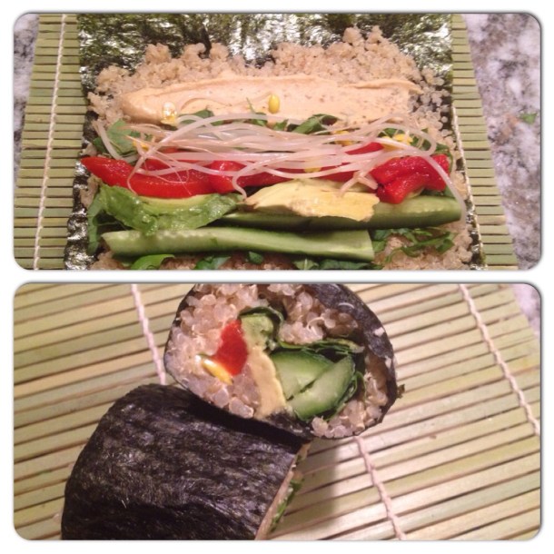 Arrange the rest of the ingredients over the quinoa and tightly roll the nori. Slice with a sharp knife. I made about 6 rolls.